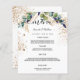 An elegant, modern and wedding menu. A white background decorated with eucalyptus greenery and golden leaves. Golden faux glitter spots. Personalise and add your names, date and the wedding menu. Black coloured letters. The word Menu is written with a trendy hand lettered style script with swashes. Back: white background and golden faux glitter drops.