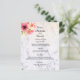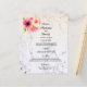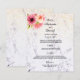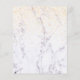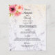An elegant and romantic wedding menu card. White marble print with golden confetti as background. Watercolored dahlia flowers in purple, pink and living coral. Templates for your names, date and wedding menu.