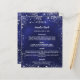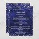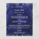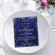 A classic wedding menu. A navy blue background, decorated with faux silver glitter sparkles. The blue colour is uneven. White text. Personalise and add your name, date and the menu.