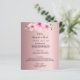 An elegant tropical wedding menu card. Pink flowers, florals hibiscus as decor. Rose gold, dusty rose faux metallic looking background. Templates for your names, date and the wedding menu. Black coloured letters.