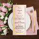 An elegant, minimalistic, glamourous wedding or wedding anniversary menu card. Templates for your names, date and the wedding menu. A faux gold frame and a chic, glamourous rose gold, pink, faux metallic looking background. Black coloured letters.