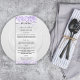 An elegant, glamorous wedding menu card. Personalize and add your names, date and the wedding menu. Faux silver looking background, decorated with violet confetti.