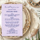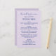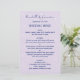 Lavender purple wedding menu template. Hibiscus flower outlines make a light pattern over the background. Text is dark navy blue with names of the couple at the top with date and menu title. Add all menu items in a paragraph as you choose. The sample wording has each section started with uppercase lettering and spaces between sections. The back of the paper is a darker purple with the same floral pattern.