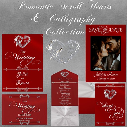 The Wedding Menu is on the front and a Thank You message for your guests is on the back. Designed to coordinate with the "Romantic Scroll Hearts & Calligraphy" Wedding Collection. To change details, click «Personalise». To move the text or change the text size, font, or colour click «Click to customise further»