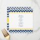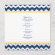Wedding dinner menu in elegant dark navy blue, bright lemon yellow and white with fun retro chevron zigzags pattern, customisable with your details and available in matching wedding products.