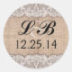 beautiful rustic burlap background and white lace sticker, seal for wedding, save the date, engagements etc.