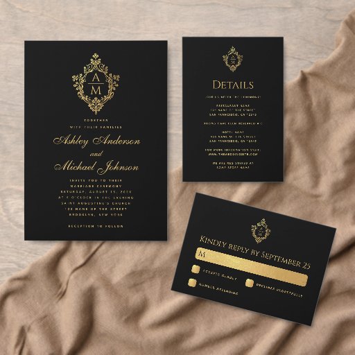 Black Faux Gold Monogram in Crest Wedding SuiteDesigned by Artifex Designs