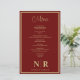 Crafted with sophistication in mind, our personalised dinner menu features a deep, rich hue of dark red accented with luxurious gold detailing. The elegant design showcases your custom monogram, adding a personalised touch that sets the tone for an unforgettable evening.