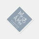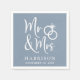 Custom dusty blue napkins for your wedding reception with "Mr & Mrs" in a large white script and a white illustration of two wedding rings joined together. Add your last name and wedding date.