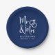 Custom navy blue paper plates for your wedding reception and wedding events with "Mr & Mrs" written in a large white script and a white illustration of two wedding rings joined together. Add your last name and wedding date.