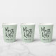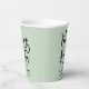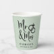 Custom sage green paper cups for your wedding reception and events. "Mr & Mrs" is written in a large script next to an illustration of two wedding rings joined together. Personalise with your last name and wedding date.