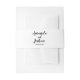 An invitation belly band is a decorative wrap that holds together the various components of a wedding or event invitation suite, such as the invitation card, RSVP card, and additional information inserts. Made from various materials like paper, fabric, or ribbon, belly bands add a touch of elegance and cohesion to the overall presentation of the invitation package. Here are some key features and aspects of invitation belly bands: