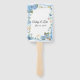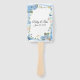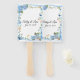 This wedding paddle fan is shown with a pretty blue floral and butterfly print and sample names and date.