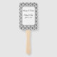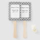 This wedding paddle fan is shown with a elegant black and white damask print and sample names and date.