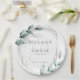 Wedding Paper Plate | Greyed Jade Green Botanical - variations of Greyed Jade Green - muted jade green leaves surround the terrarium style gold frame. Fresh and simple - yet deliciously elegant. This is part of a design coordinated wedding suite collection designed by the BarefootBride™. Features a simple classic text style (that can be changed if you like just Click Personalise this template then in the drop down, click Click to customise further- here you can change the font and text colours)