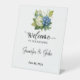 This pedestal sign is shown in a wedding format, shown with a lovely hydrangea's art print.