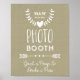 Wedding photo booth sign poster in rustic burlap pattern with vintage laurel wreath and arrow with illustration with hearts and hand lettered style text and monogram.