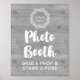 Wedding photo booth sign poster in rustic grey wood pattern with vintage wreath illustration and hand lettered style custom text and monogram.