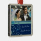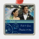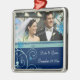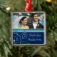 Winter Wedding photo ornament customisable with your own wedding photo and wedding date in elegant blue and turquoise with festive snowflakes and swirls pattern. A stylish christmas gift for family and friends or to decorate your christmas tree or home for the holidays. The perfect way to remember your winter wedding day.