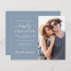 Budget-friendly dusty blue wedding save the date announcement featuring your photo and "Happily Ever After" in a mix of simple modern white typography and a stylish white script with swashes. Personalise your save the date details and add your names in a signature-like script. Your names and wedding date are joined together by a heart on the back.