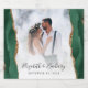This modern wedding design features emerald green watercolor agate and gold faux glitter borders on the left and right edges. Personalise it with a photo of the bride and groom, along with their names in elegant handwriting script and the wedding date below. A white gradient filter helps make the black text pop.