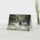The card shows an example image of a couple on their wedding day, the wife is blonde and wearing a lace boho wedding dress and the groom is wearing a sharp rich blue suit. They are walking in a meadow grass framed by rows of mature trees. The scene is wild and romantic. This images is designed as a placeholder to be replaced by your favourite photo or family picture.