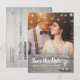 Save The Date Wedding Invitation Photo Postcard Templates - Elegant Lettering Script, Vintage Champagne Glasses and String Lights on Rustic Wood Background.