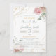 An elegant wedding invitation with pink roses, sage green leaves, and gold glitter.
