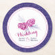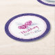 Pine cone drawing art personalised wedding paper coasters with plum purple cones and navy natural weave fabric effect outer. A perfect finishing touch to your pine cone wedding event tables. Customise with your own wedding names. Ideal for winter, rustic or country weddings. Unique drawing and design by Sarah Trett for www.mylittleedenweddings.com on zazzle.