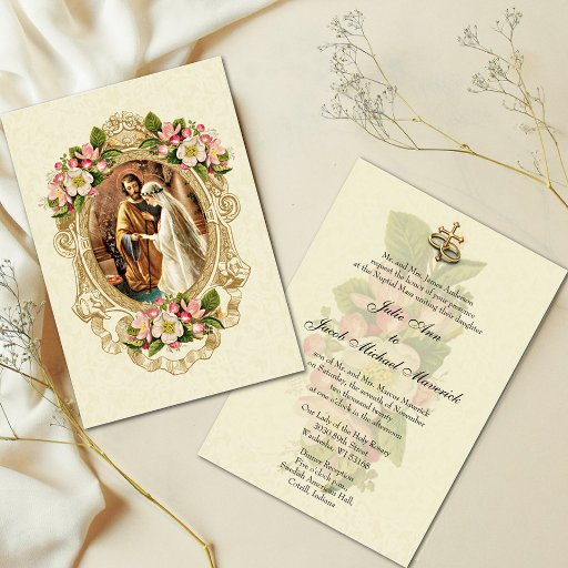 Featuring a lovely SAVE THE DATE postponement card with vintage cherry blossoms, a gold crucifix and wedding rings on a light lace background. The script is a Scripture quote from Corinthians, "LOVE IS PATIENT".. Be sure to check out all the coordinating products in our wedding essentials collection.