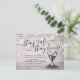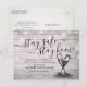 Modern Wedding Announcement Postponement Photo Postcard Templates - Elegant Lettering Script, Vintage Champagne Glasses and String Lights on Rustic Wood Background.
