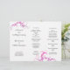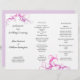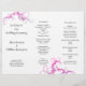 Wedding program template in white with magenta flourish design. Sample is shown on pretty, and affordable, linen paper with custom text in three sections to be folded in thirds after purchase. Embellishments, in the form of leafy swirls of colour, decorate the left side of the paper, which will be the front of the program. Another flourish of colour is at the bottom between the centre and last page. Fold this paper like an accordion and be sure to double-check all text for correct spelling and placement. The reverse is a solid lavender colour.