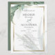 Elegant modern tropical green leaves surrounding a gold geometric frame at diagonal corners. Reverse is a complimentary coordinated colour. Customise text, font style, colour and size. Original artwork created for the BarefootBride™ by © WhimsicalArtwork™. This is part of a complete Wedding Stationery Suite with matching wedding, baby shower and other event stationery.