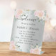 A welcome/program, timeline poster for a wedding. A stylish faux silver looking background decorated with blush pink and white flowers. Personalise and add your names and the details. Black letters.