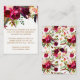 This beautiful burgundy watercolor florals and feathers wedding reception enclosure card insert features burgundy, crimson, aubergine, marsala, and cream roses or peony type flowers with greenery leaves and branches in shades of olive green, rust, burnt orange, and brown, along with assorted colourful feathers in orange, purple, grey, and black. The customisable wording is in a gold and burgundy colour palette and the back has an all-over pattern of bouquets in the same colours.