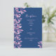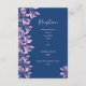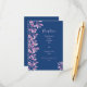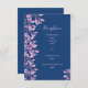 An elegant floral wedding reception details card in blue and pink. A trendy blue background on the front. Decorated with watercolored botanical pink coloured sprigs and foliage. Templates for your wedding reception details, pink text.