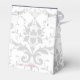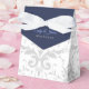 Shown here is the tent style favour box. This box coordinates with the temple wedding invitation and reception invitation. Has the Silver Coronation pattern on all sides of this favour box. Personalised names of the newlyweds across the top flap over Sapphire Blue. To personalise the names, click the "unfolded" button after clicking customise button. Customise this item to your desires.