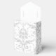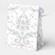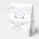 Shown here is the tent style favour box. This box coordinates with the temple wedding invitation and reception invitation. Has the Silver Coronation pattern on all sides of this favour box. Personalised names of the newlyweds across the top flap. To personalise the names, click the "unfolded" button after clicking customise button. Customise this item to your desires.