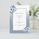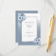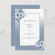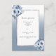 An elegant wedding reception details card. A faux silver and white frame with watercolored roses in shades of blue. A chic dusty blue gradient, ombre background. Templates for your wedding reception details, dark gray text.