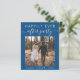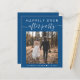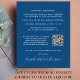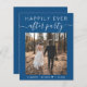 Budget-friendly classic blue elopement and private wedding announcement with a reception invitation. The front features your photo and "Happily Ever After Party" in white typography and stylish white script with swashes. Add your first names and wedding date. On the back, personalise your wedding announcement and reception invitation in more detail, input your wedding website URL address to create a QR code for guests to scan to see your wedding photos, all the details and to RSVP online, and add your names in a signature-like script.