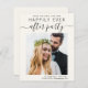 Modern budget-friendly light cream elopement / private wedding announcement and reception save the date that features your photo and "Save The Date For Our Happily Ever After Party" in a mix of simple typography and a chic script with swashes. Under your photo, add your names and reception date and location; on the back side, personalise your wedding announcement, input your wedding website address to create a QR code for your guests to scan for more information and add your names in a signature-like script.
