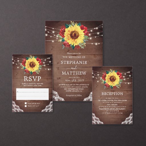 This wedding reception enclosure card features a watercolor sunflower and red roses floral design with lace and string lights on a wood background. Other matching wedding stationery items are also available. Please visit our store to see the full range.