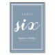 This design was created for smaller intimate wedding celebrations. Simple, minimalist and elegant Wedding Table Number SIX design features a contemporary design with a double frame border in crisp white on a dusty blue background. The design is chic and timeless. Personalise wedding table design with your wedding details in dusty blue lettering and script. The back of the card is a duplicate of the front. Order one for every table with the individual table numbers.