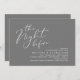 Announce your happily ever after in style with our modern classy aesthetic dark grey theme design (The Night Before) wedding rehearsal celebration invitation card. It is ideal for couples who have decided to celebrate the night before their big day. With its sophisticated yet playful design, this invitation is sure to set the tone for an unforgettable event. The invitation card features modern romantic script design, adding a touch of timeless elegance to your celebration. Designed by TeeshaDerrick