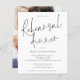 Wedding Rehearsal Dinner with Picture Invitation. A value for money BUDGET alternative on a smaller size 4.5 x 5.6” semi-gloss 110lbs weight, which is of similar thickness to a postcard (however is not suitable to use as a postcard.). PLEASE NOTE there is ONE invite per sheet Shown in classic black and white. This modern design has elegant informal set script for Rehearsal Dinner and the rest of the typography you can easily personalise. You can also change text and background colour if you wish via the Customise Further option. Replace the sample photo on the back with your own.