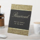 Elegant, simple, glam glitter gold and black wedding Reserved table pedestal sign with modern calligraphy script.
