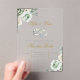 Invitación de boda acrílico con anillo y flores verdes