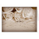 Bridal rose bouquet with wedding rings in sepia tones with soft vignetting.