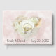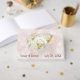 Wedding bands in a seashell with flowers and net in abstract heart frame on pink watercolor background.