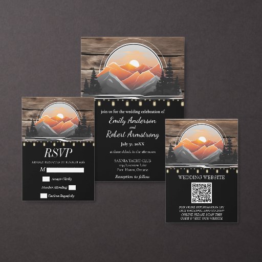 Capture the essence of nature's beauty with this breathtaking Rustic Mountain Valley Forest Sunset Wedding Invitation Suite. charm of a secluded woodland retreat, this suite features a stunning sunset over a misty forest valley, complemented by a barnboard texture and elegant black background. The rustic feel is enhanced by soft, glowing mason jar lights, casting a warm, intimate glow over the invitation. Perfect for couples looking to blend elegance with rustic charm, this suite sets the tone for a wedding surrounded by nature’s splendour. The earthy tones of the design, paired with the natural wood and glowing lights, create a welcoming atmosphere that will transport your guests to a relaxing night of celebration.
